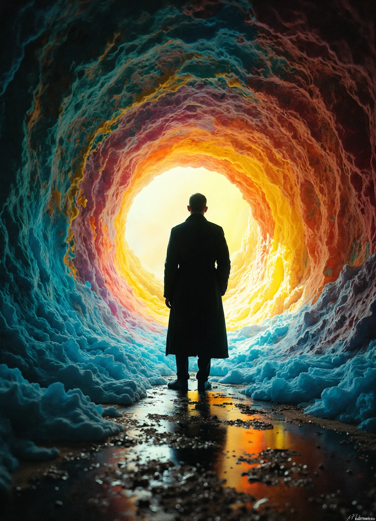 the vibrant colors within the cave, which appear to be ice formations that reflect the light entering from the opening. It seems to be taken from behind, focusing on the figure rather than the surroundings. The scene has an ethereal quality due to the lighting and the otherworldly appearance of the cave's formation.
