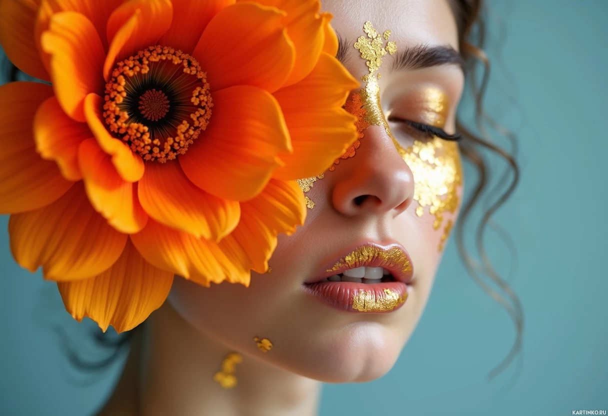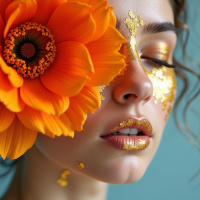 orange flowers, one of which serves as a headpiece, adding a vibrant contrast to their makeup and skin tone. The background is