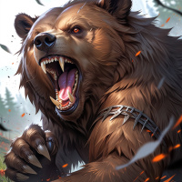 brown bear with a fierce expression, its mouth wide open as if it is roaring or growling. The bear has prominent