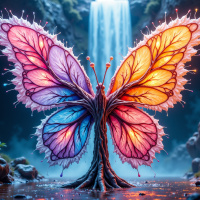 This image features an artistic depiction of a tree with a butterfly perched on it. The tree is intricately designed, mimicking the branching structure of a plant, and the butterfly has wings that are vibrant in color, with each wing having