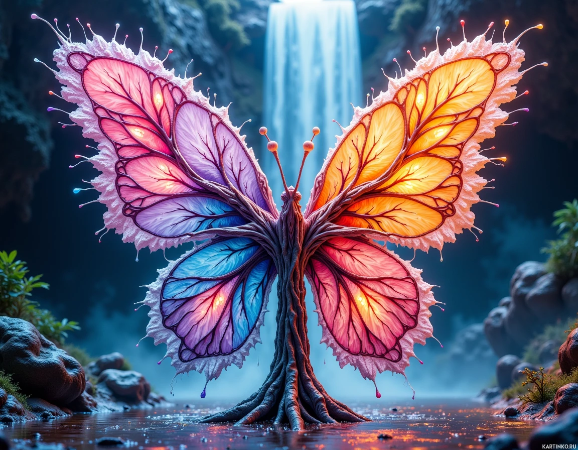 a fantastical landscape, possibly inspired by nature themes. There's a waterfall or cascade in the background, contributing to a serene and ethereal atmosphere. The lighting is soft, creating a dreamy quality to the image. The overall impression is one of a magical or otherworldly scene where elements from nature are stylized with