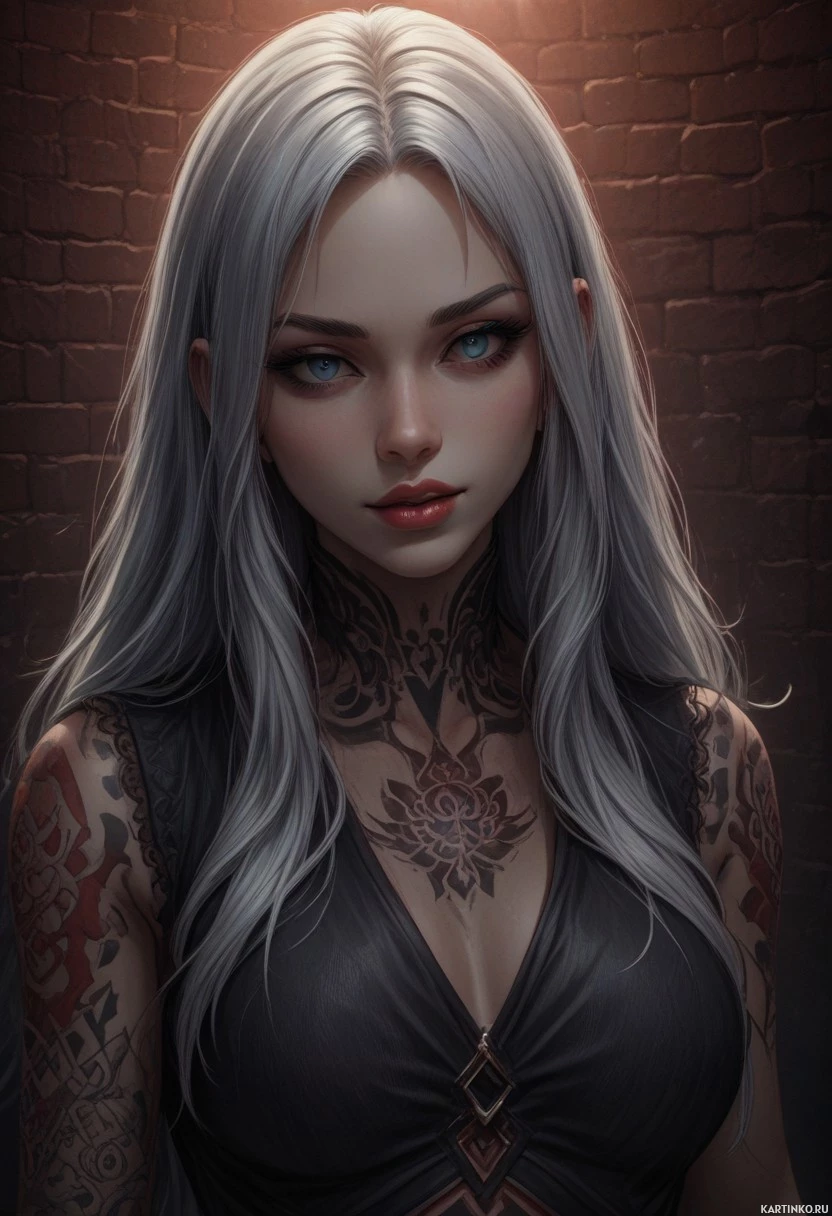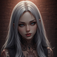 multiple tattoos on her arms, which add to her edgy and dark aesthetic. The character wears an outfit that appears to be black, fitting closely around the neckline and shoulders. It has