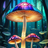 otherworldly creatures resembling mushrooms, each one unique in color and design. These mushroom-like entities are adorned with glowing spots and appear to be floating just above