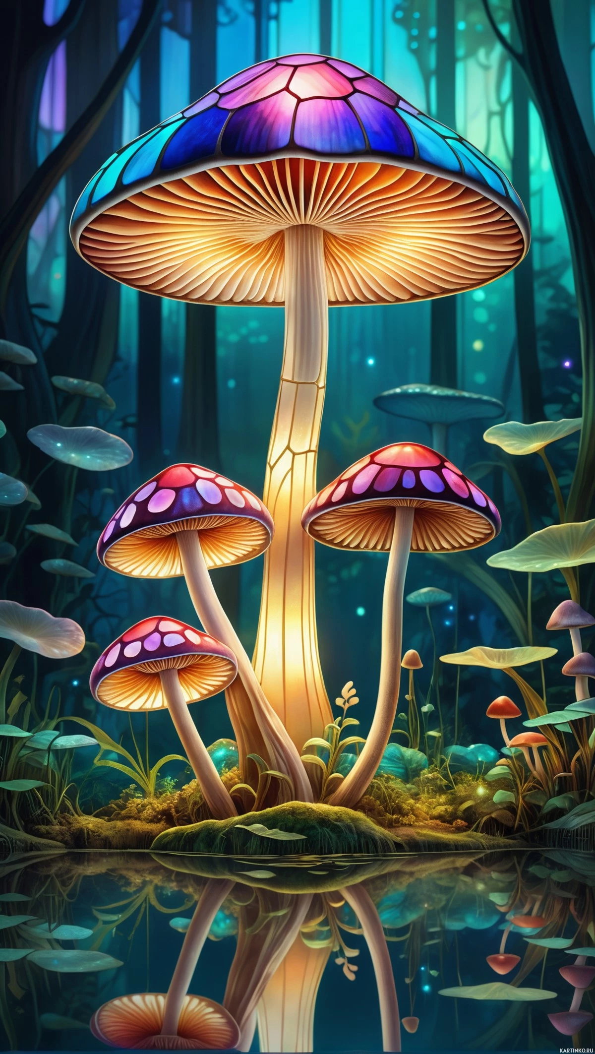 body of water that reflects her luminescent form. Surrounding the fairy are several