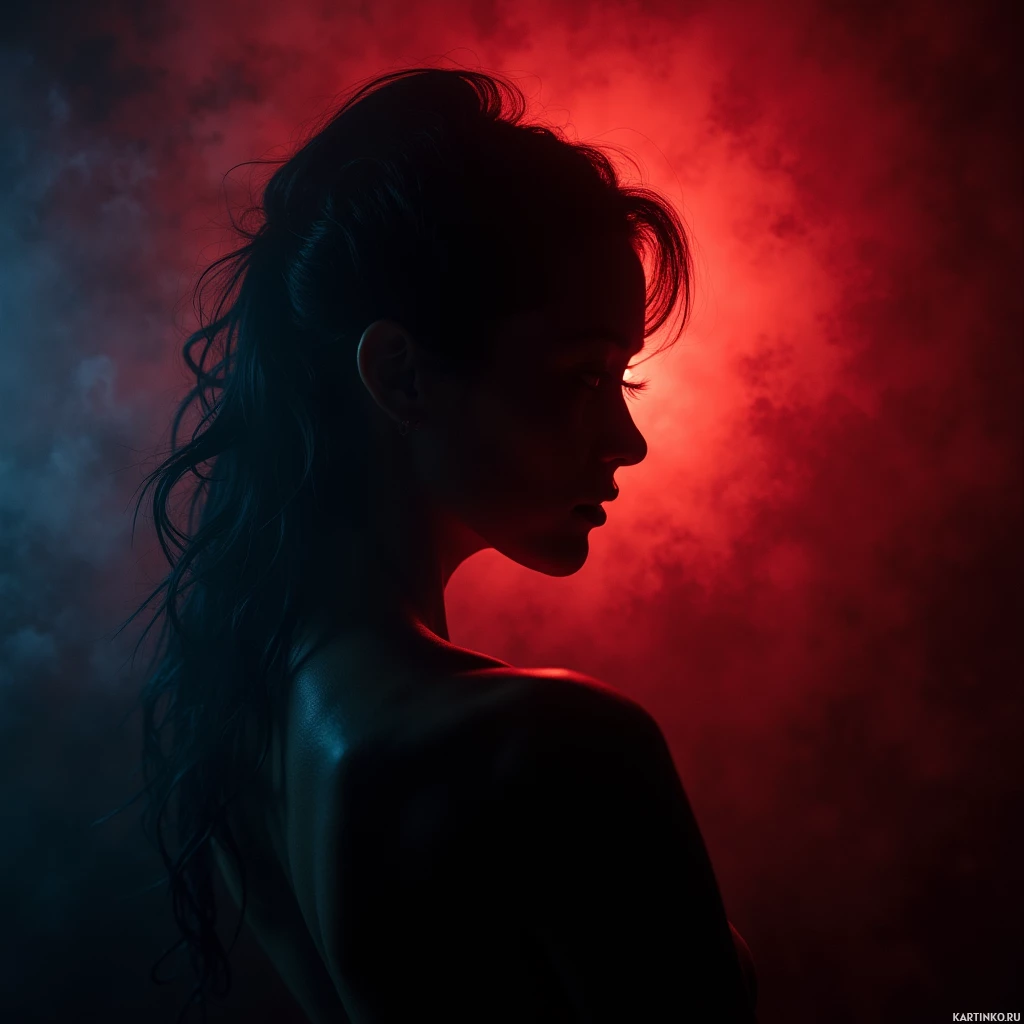 На картинке изображена силуэт женщины с длинными темными волосами, собранными в хвост. Голова повернута в профиль, выражение лица задумчивое или полное глубоких мыслей. Взгляд направлен куда-то в сторону, избегая зрительного контакта. Освещение создает драматичные тени на ее лице и фигуре, подчеркивая силуэтный эффект. Красные и синие световые элементы добавляют динамичный и яркий фон. На ней темный топ или платье с тонкими бретельками, что придает ее позе элегантность. Общее настроение картинки передает ощущение внутренней сосредоточенности или тихой напряженности.