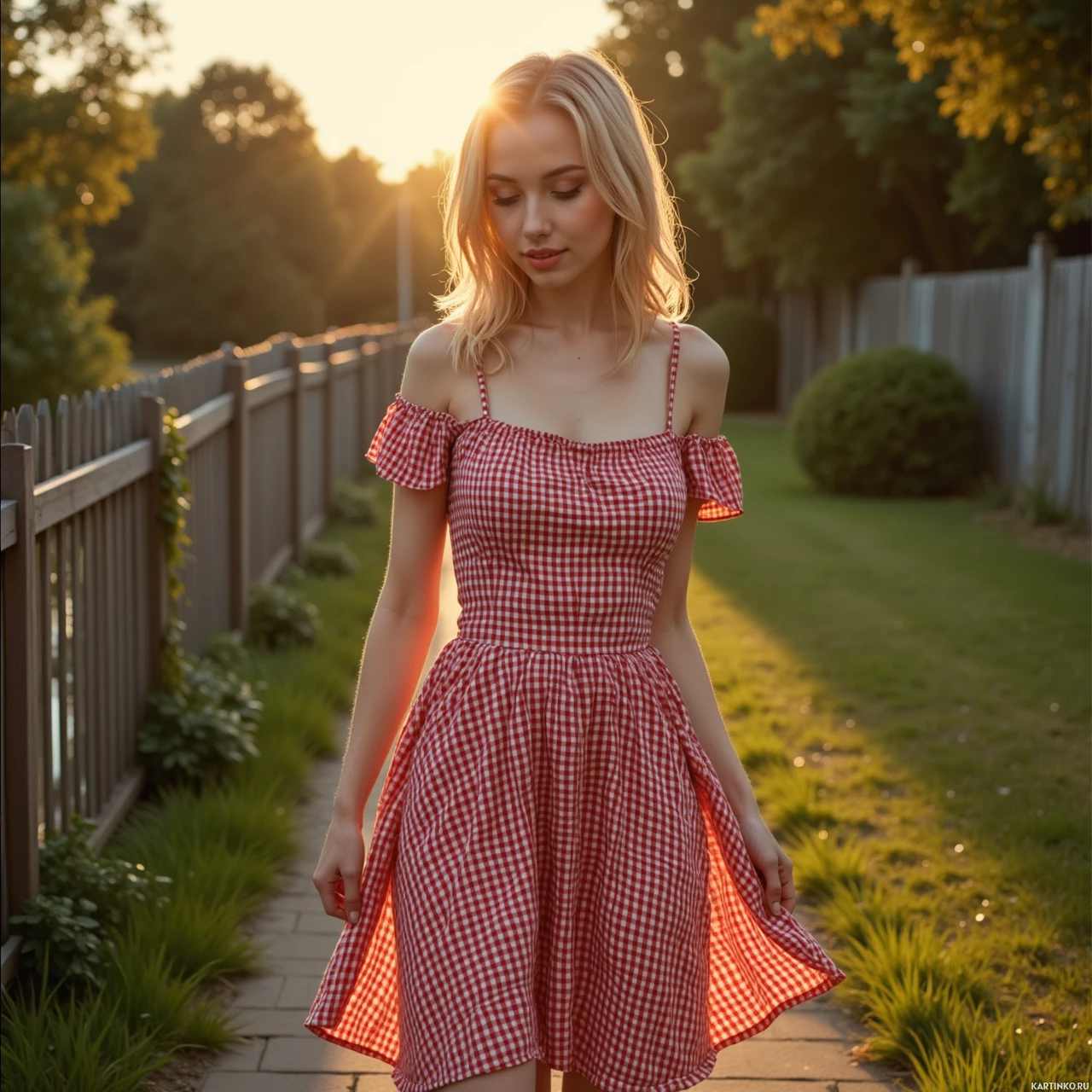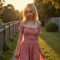 blonde hair and is wearing a sleeveless red dress with white polka dots, which gives the impression of a classic picnic or summer dress style. Her posture suggests she's walking casually, perhaps enjoying