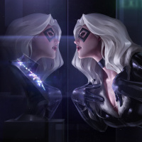 a black outfit with sleek lines that suggest a form-fitting design. The character appears to be looking at her own