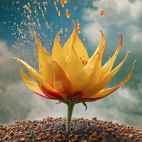 a rocky surface and some floating debris or particles that could be part of an explosive reaction. The overall atmosphere of the image is dramatic and intense, perhaps symbolizing transformation or rebirth amidst chaos.