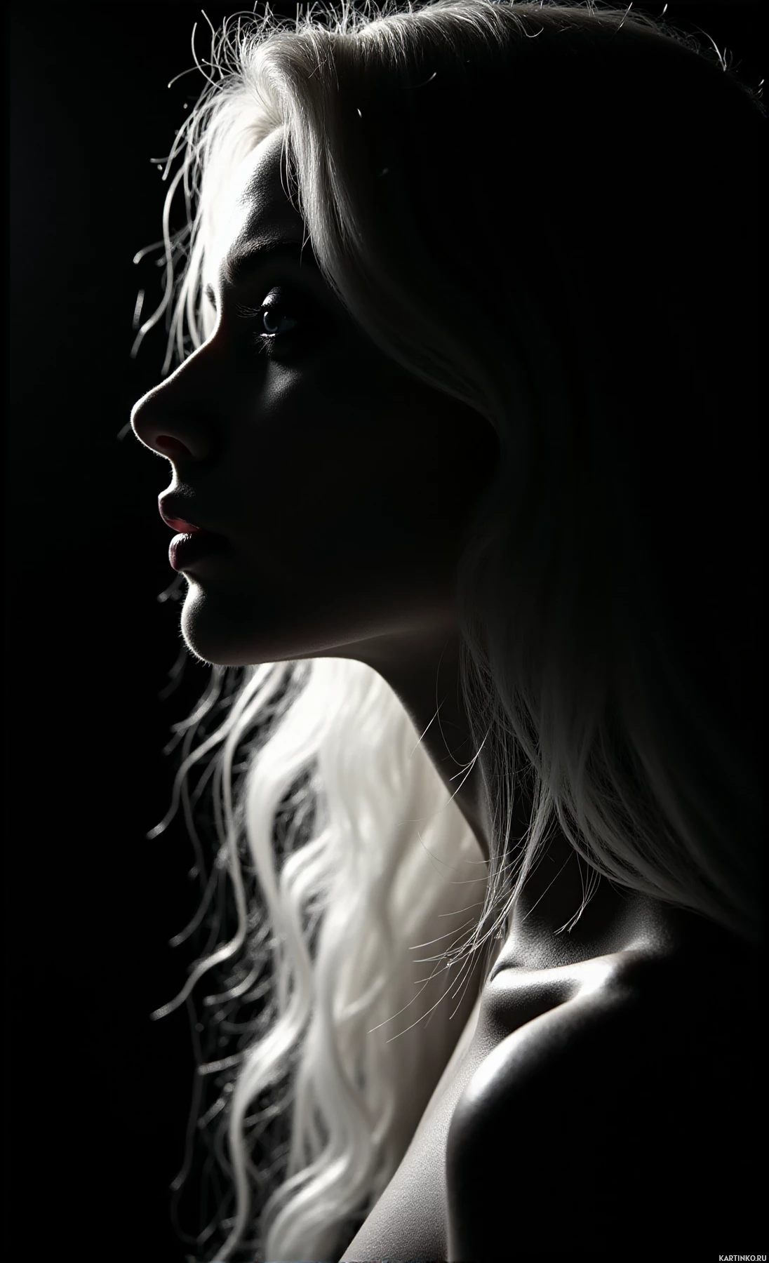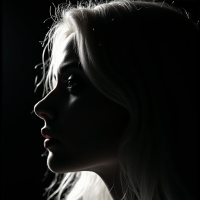 a dramatic effect with deep shadows on her chin and cheekbones, while highlighting her hair and the texture in her skin. On the right side, the lighting is soft and evenly diffused, making her features appear less pronounced and more subdued. The person has pale skin,