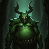 green skin with visible veins, and its eyes are glowing red. The creature is adorned with what appears to be