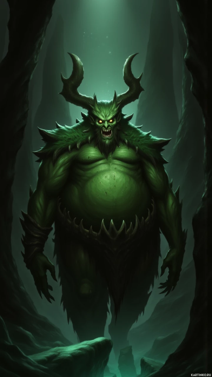 a fantasy monster standing in a dark cave setting. The creature has a humanoid shape but with non-human features such as