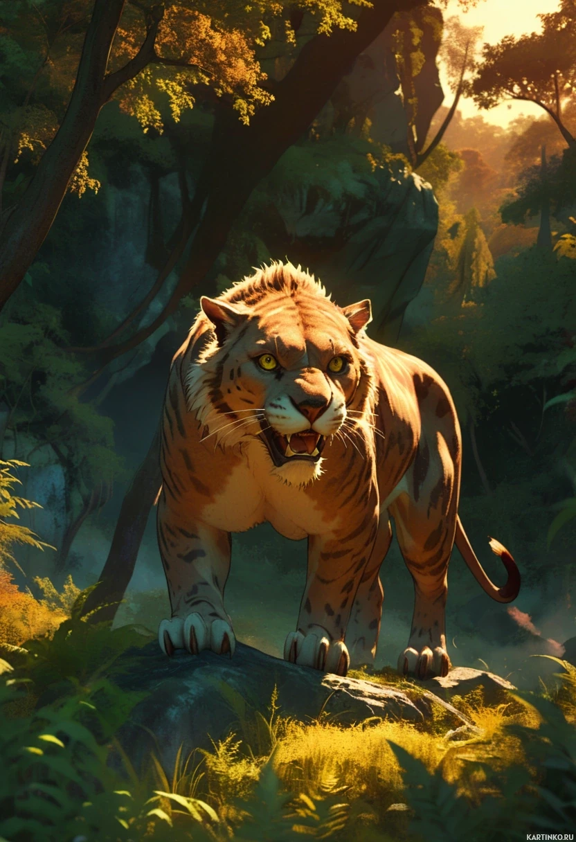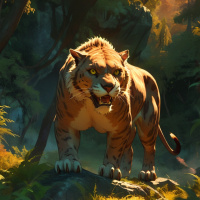 wooded environment. The tiger is depicted with a prominent presence, displaying its