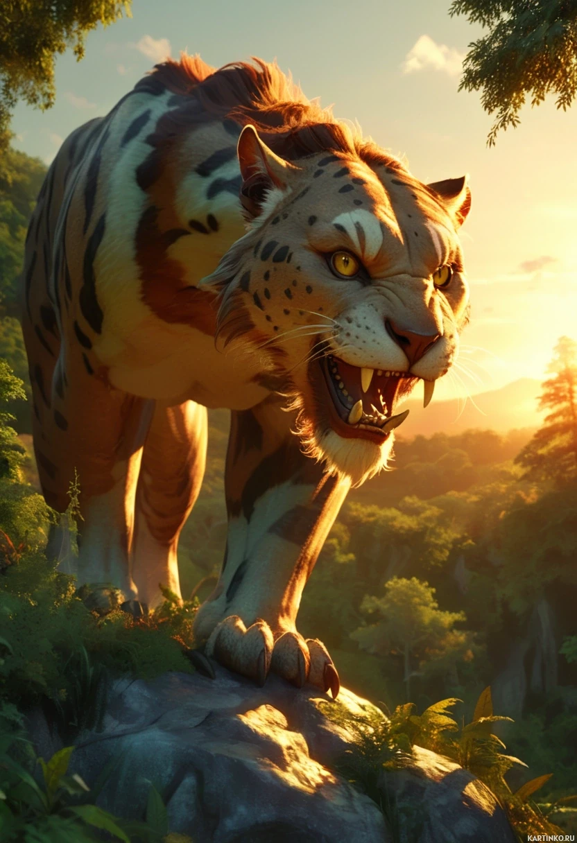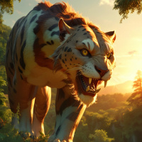 an aggressive stance, baring its teeth as if growling or roaring. Its fur appears to be a mix of brown and orange hues, characteristic of real-life tigers such as the Siberian or Bengal varieties. The background suggests a lush forest landscape, possibly during sunrise or sunset due to