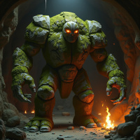 the ominous atmosphere. To the right of the golem, there are small flames flickering on the ground, suggesting some form of