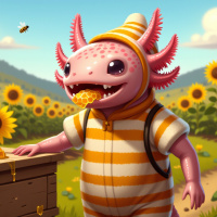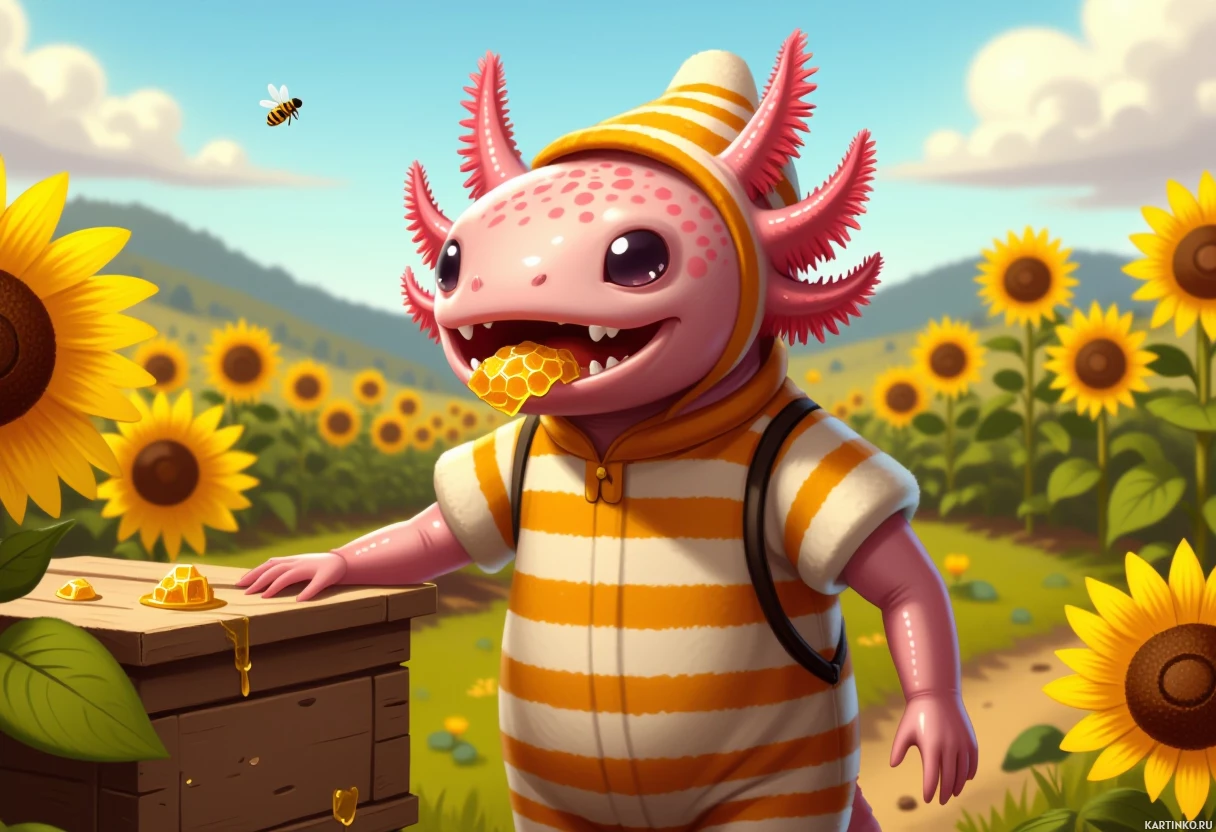axolotl character stands in front of a backdrop that features vibrant sunflowers and grass, creating a cheerful and whimsical atmosphere. There is also a bee flying nearby, contributing to the playful