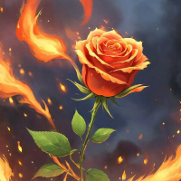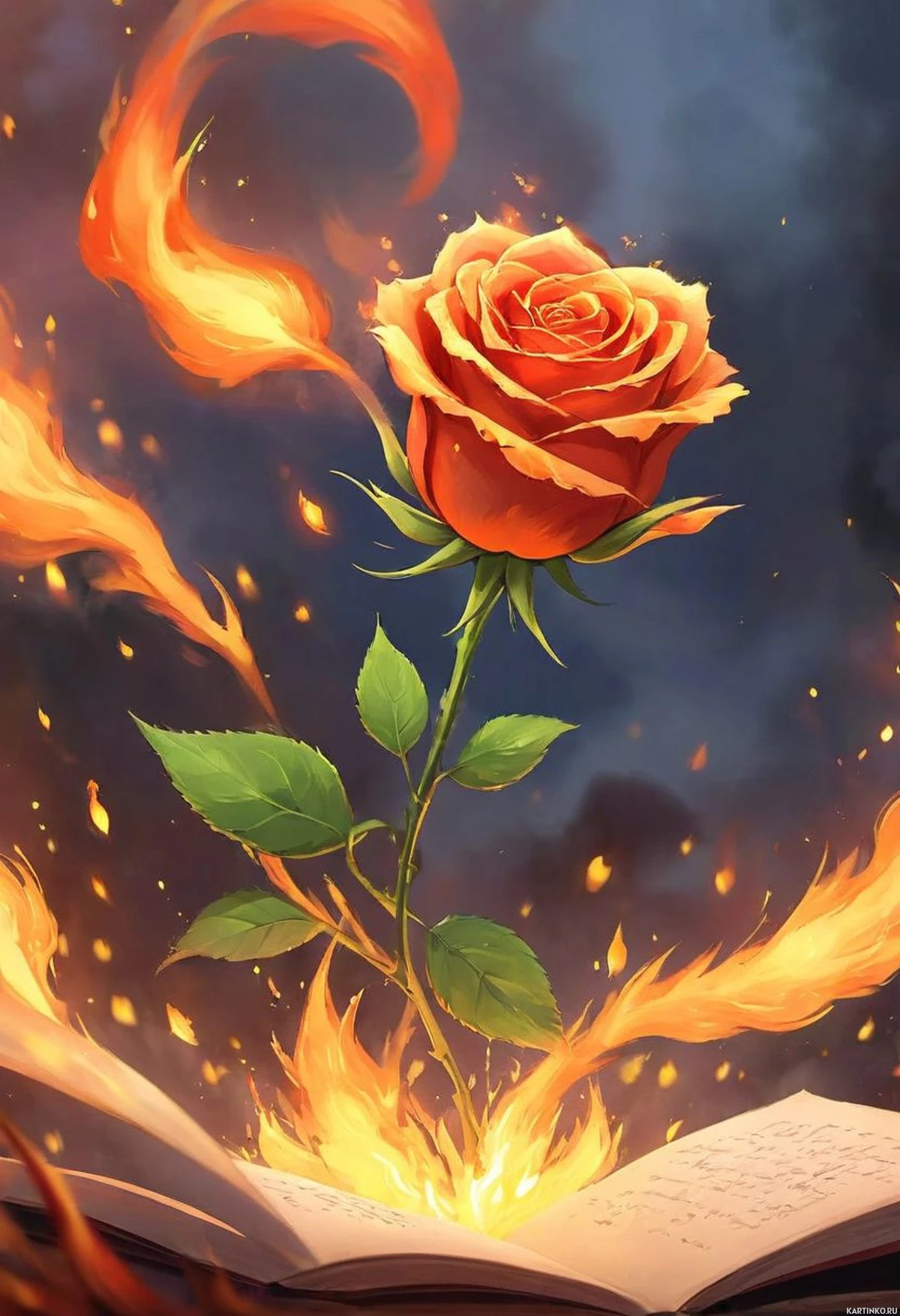 На картинке – одинокая роза в центре, обвитая языками пламени. Эта центральный мотив словно выдержан на фоне, напоминающем раскрытую книгу или страницы сказки. Общее впечатление от композиции передаёт мотивы любви, страсти, и, возможно, преобразующей силы литературы или письменного слова.