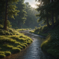 yellow flowers add a pop of color against the greenery, suggesting it might be spring or early summer. In the background, the sun is setting behind the trees, casting long shadows and bathing the forest in a warm, golden light that highlights the textures and depth of the woods. The light also reflects off what appears to be a small pond, creating a peaceful ambiance. The overall impression is one of a quiet place where time seems to slow down, inviting viewers to imagine the sounds of birds singing, leaves rustling in the breeze, and the gentle flow of the stream. The forest scene evokes a sense of wonder and offers a visual respite from the hustle and bustle of everyday life.