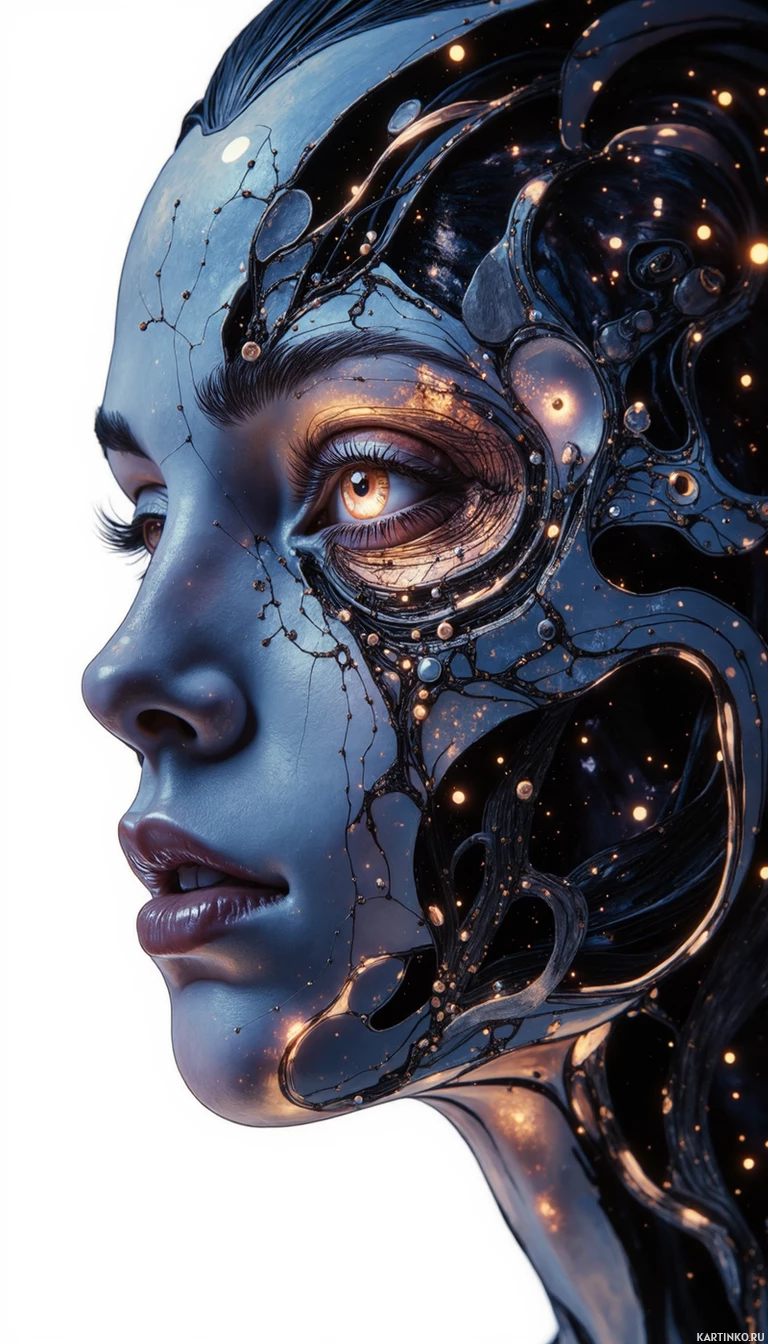 hollow eyes with sparkling reflections, and the contours of her features seem to blend seamlessly with mechanical structures and circuit-like patterns. The artwork has a dark, almost monochromatic color scheme, highlighted by hints of blue and metallic tones that enhance its otherworldly appearance. The style of the image is reminiscent of conceptual art or illustrations commonly associated with