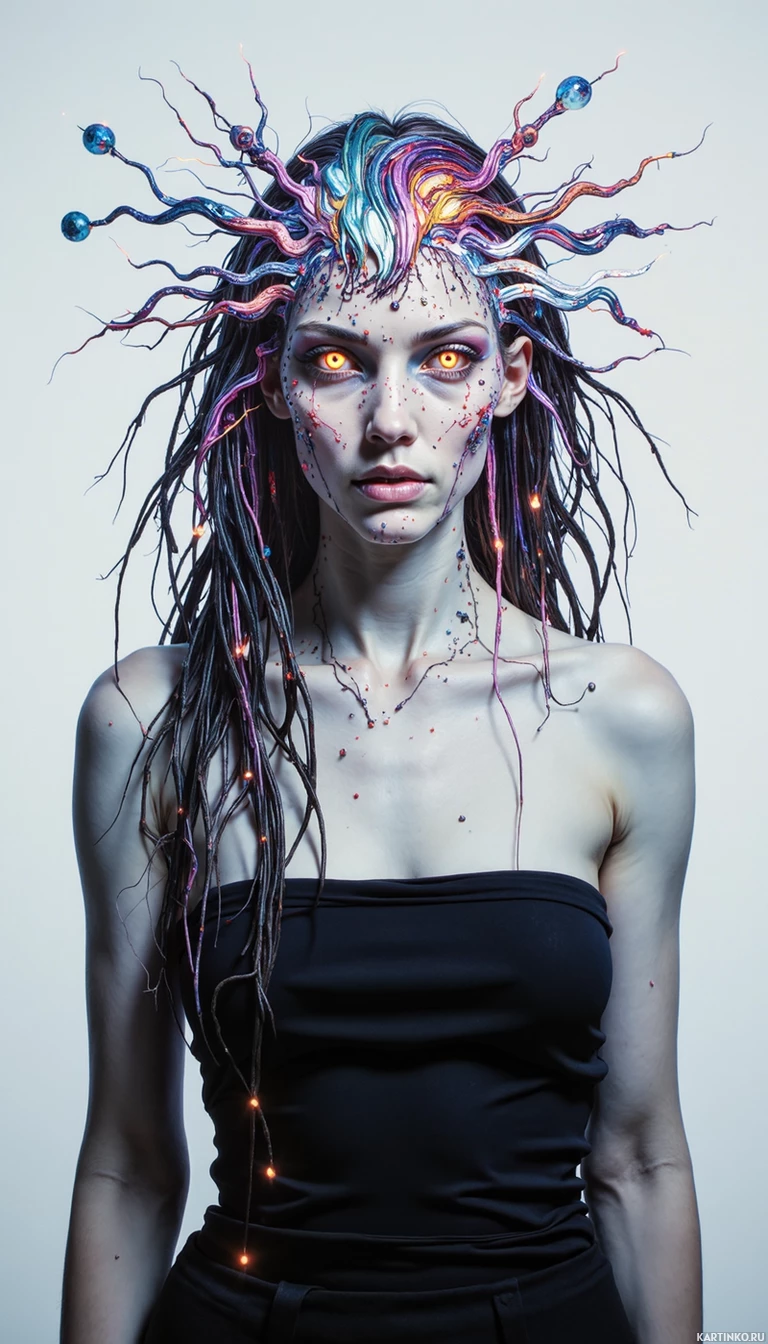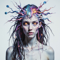 flowing hair that appears to be made from vibrant strands or fibers of various colors, including hues of blue, green, and purple. These strands seem to blend seamlessly into her head, creating a fantastical, almost alien-like effect. On her face, she has