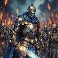 an army of skeletons marching towards the warrior, their arms raised as if in salute or preparation for battle. The use of bright flames adds to the dramatic