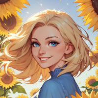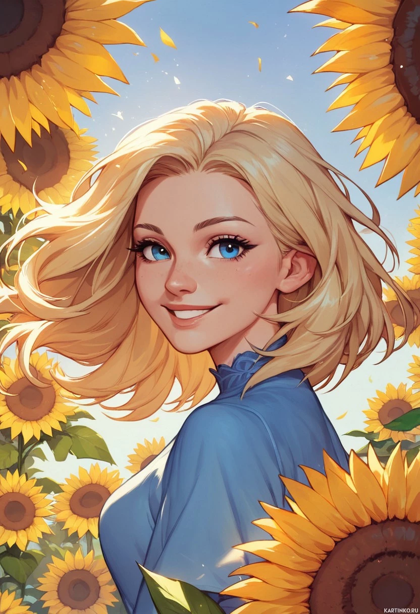 loose waves that seem to be blowing gently as if caught in the breeze. Surrounding her is a field of golden sunflowers, which are in full bloom and radiating bright yellow petals that stand out against