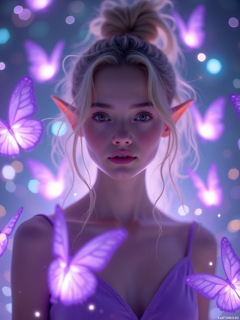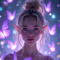 blue eyes, and her expression is one of gentle curiosity or introspection. Her makeup is soft and natural, highlighting her features without appearing overly dramatic. Around the woman's head are butterflies that seem to be floating in a magical, dreamlike manner. The butterflies have purple wings with hints of blue and green, and they glow with