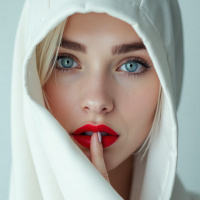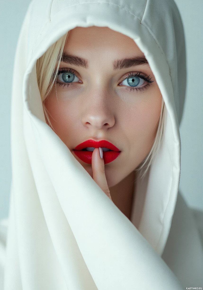 red lipstick that complements her pale skin tone. Her gaze is directed towards the viewer, giving an impression of being captured in