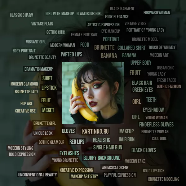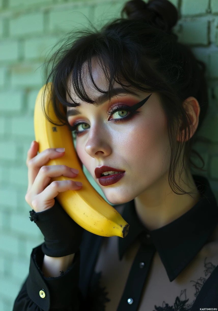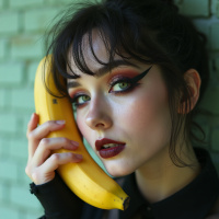 a yellow banana up to her ear as if it were a phone, and she seems to be speaking or listening into it. Her makeup includes dramatic eyeliner and