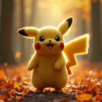 The image features an animated character known as Pikachu from the Pokémon franchise. It is set in a forest with autumn leaves, giving it a warm and inviting atmosphere. The sunlight filters through the trees, casting long shadows on the ground and highlighting the character's cheerful expression.