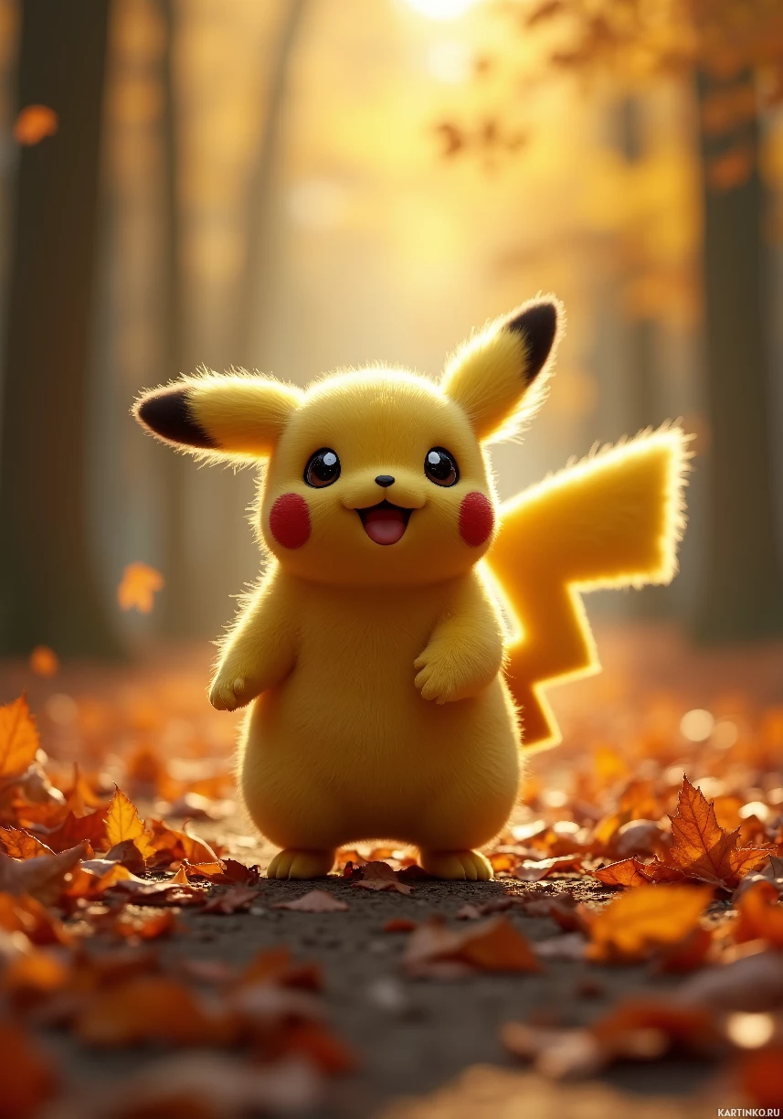 На картинке изображен персонаж из вселенной Покемонов, Пикачу. Действие происходит в лесу, усыпанном осенней листвой, что создает теплую и уютную атмосферу. Солнечные лучи пробиваются сквозь деревья, отбрасывая длинные тени на землю и подчеркивая веселое выражение лица персонажа.