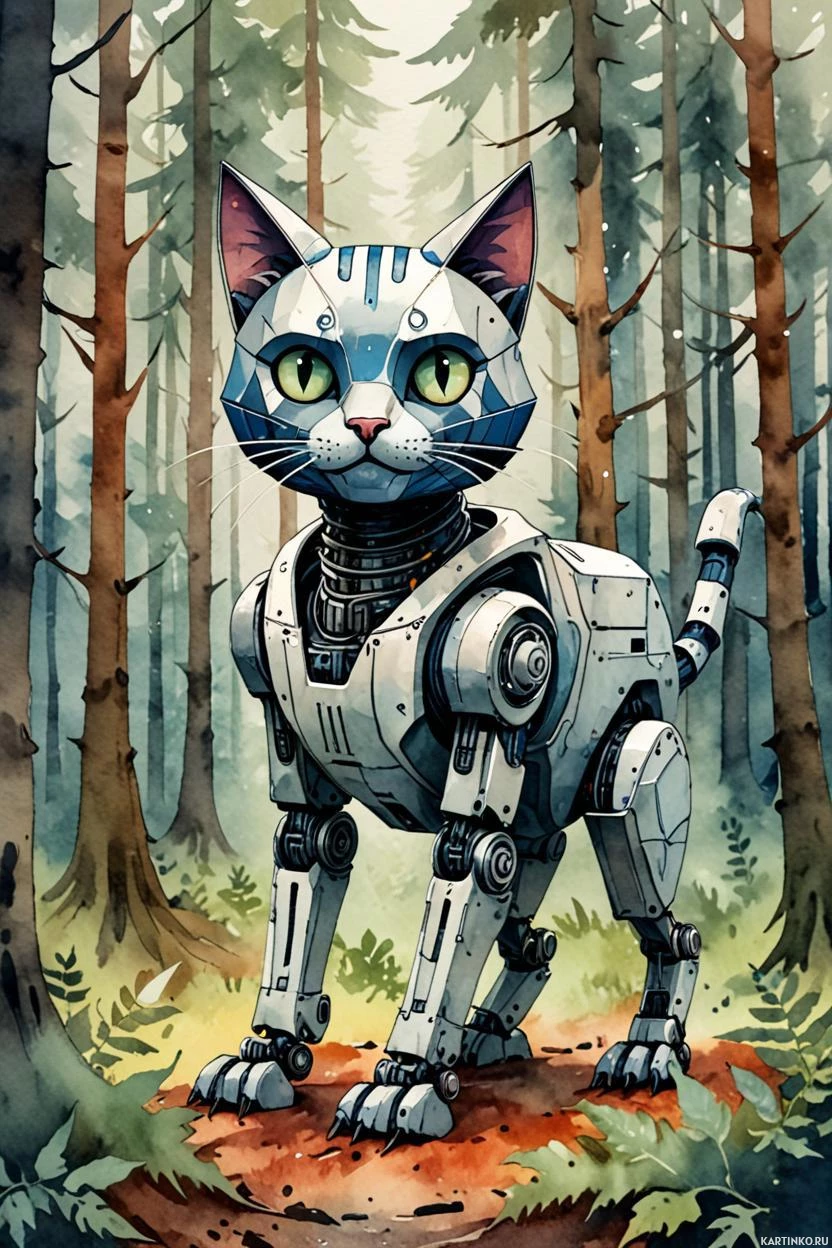 fiction scene with a robot that resembles a cat. This cybernetic feline is standing in