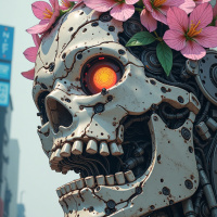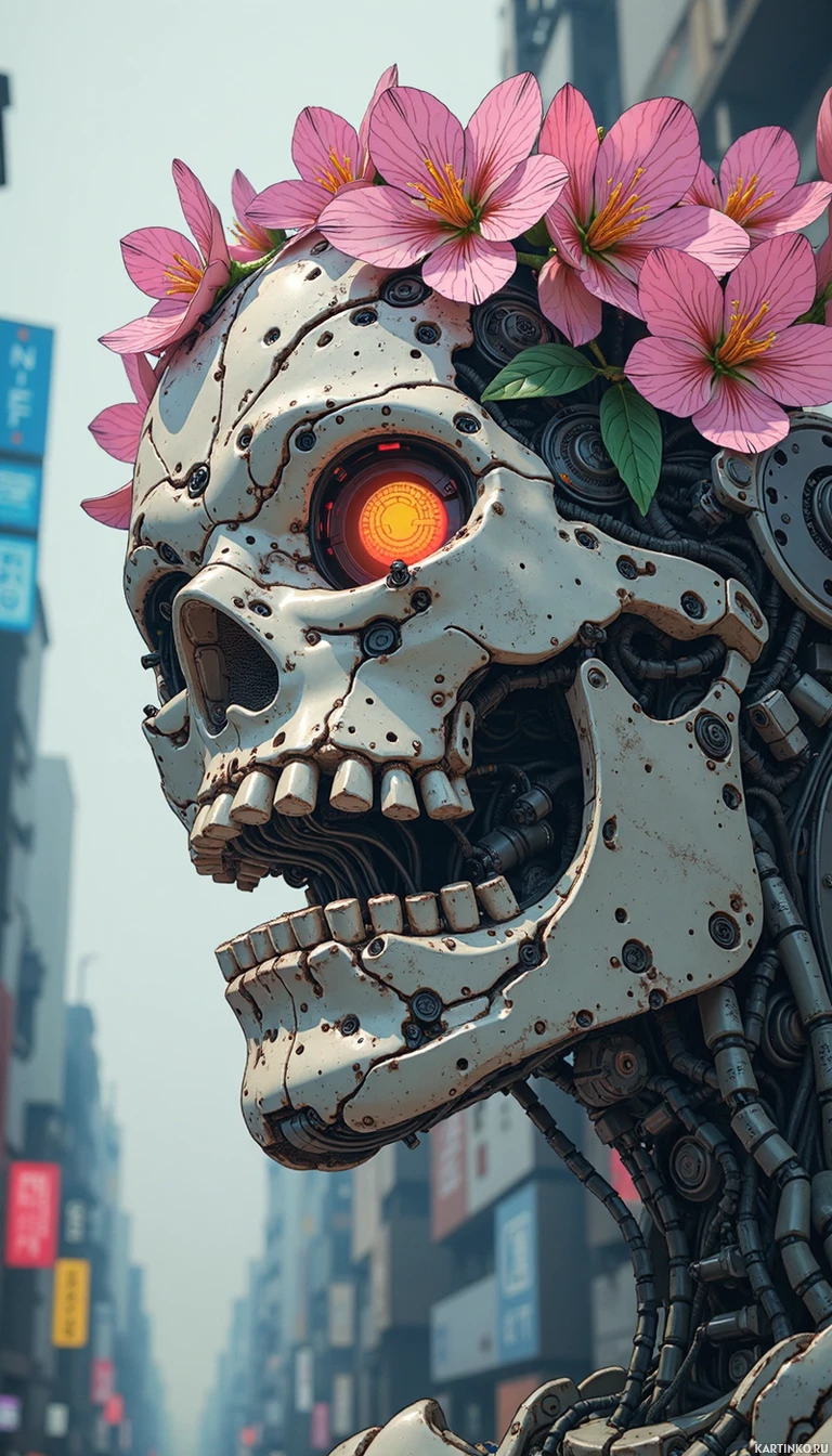 pink flowers, possibly cherry blossoms or similar type, as a headpiece. These flowers are arranged in such a way that they resemble a garland or wreath around the robot's skull, adding a touch of organic beauty contrasted with its