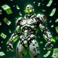 a humanoid robot standing amidst a shower of money. The robot has a metallic body with a glowing