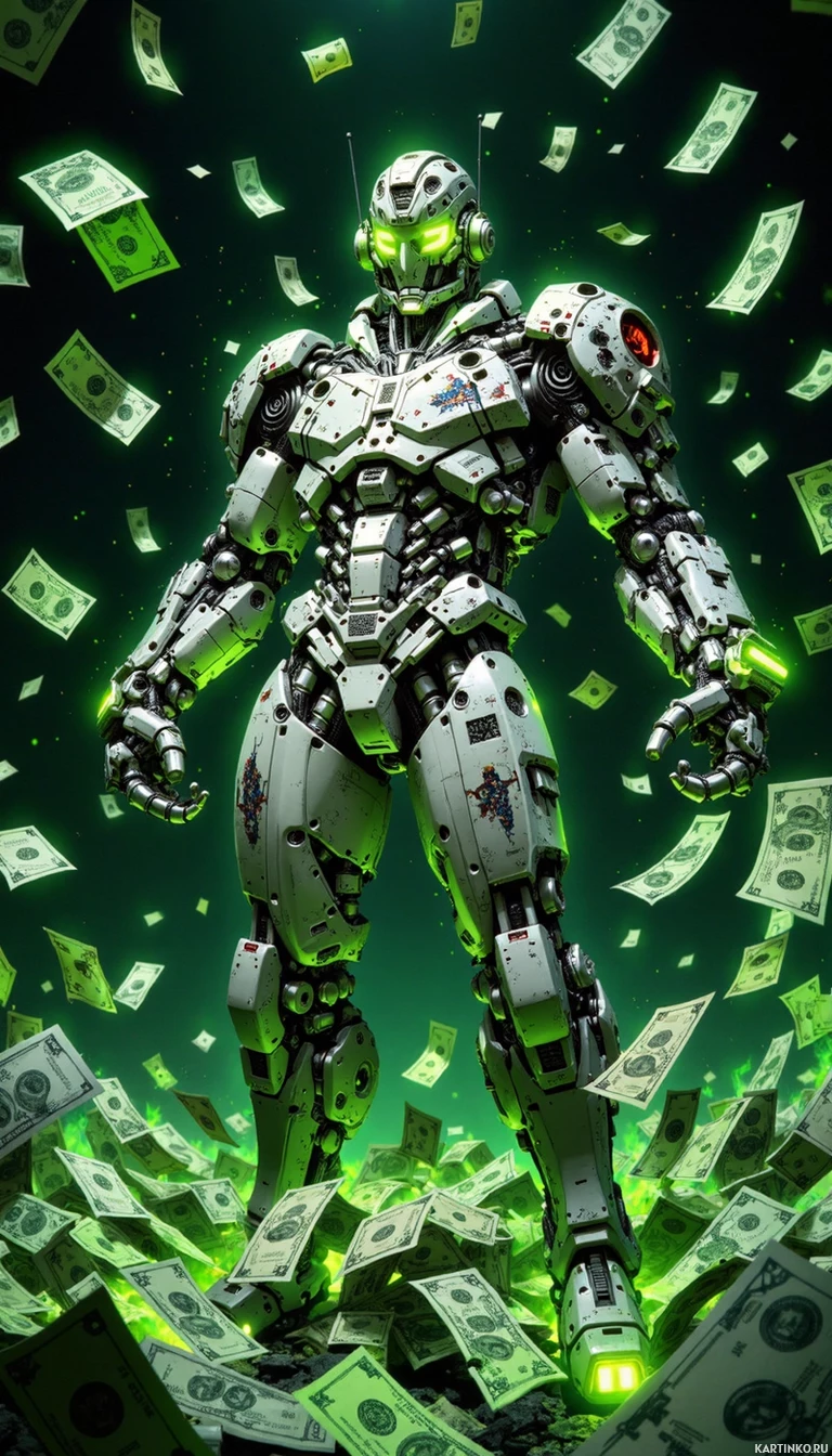 red eye and is emitting green light, possibly indicating some form of energy or power it possesses. The background is dark, contrasting with the brightly colored currency notes that are falling around the robot, implying