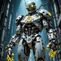 strong contrast between dark and bright areas, highlighting the robot and the surroundings. The overall composition of the image evokes a sense of intrigue about the story behind this robot and its role within the depicted society.