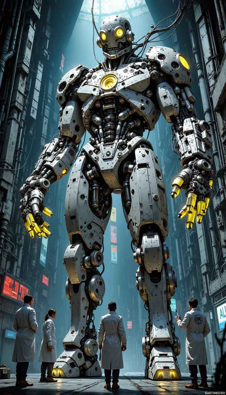 electronic components and machinery surrounding it. There are three individuals positioned at the bottom of the image who seem to be observing or interacting with the robot. The robot itself has mechanical arms and legs with a humanoid form, suggesting