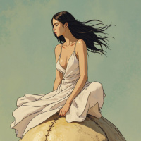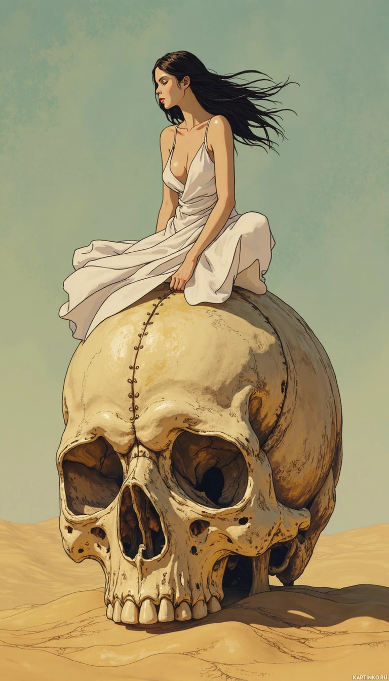long hair and is wearing a dress that cascades around her, suggesting movement or wind. She looks contemplative or thoughtful while gazing into the distance. The skull is detailed with visible teeth and cracks that imply age or decay. The background consists of sandy ground with dunes, implying