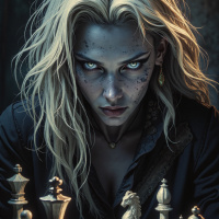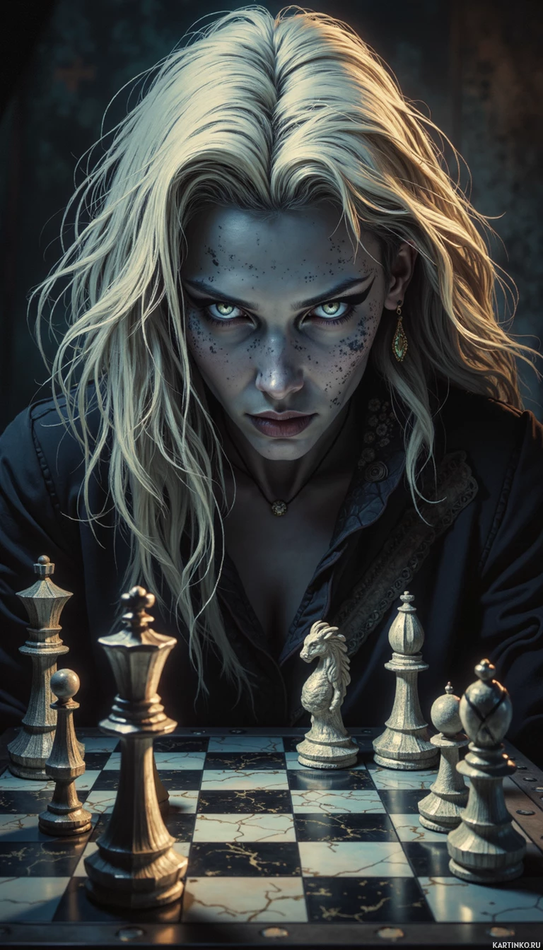 blonde hair, dressed in a dark outfit that includes what appears to be a corset. She is sitting at a chessboard, where