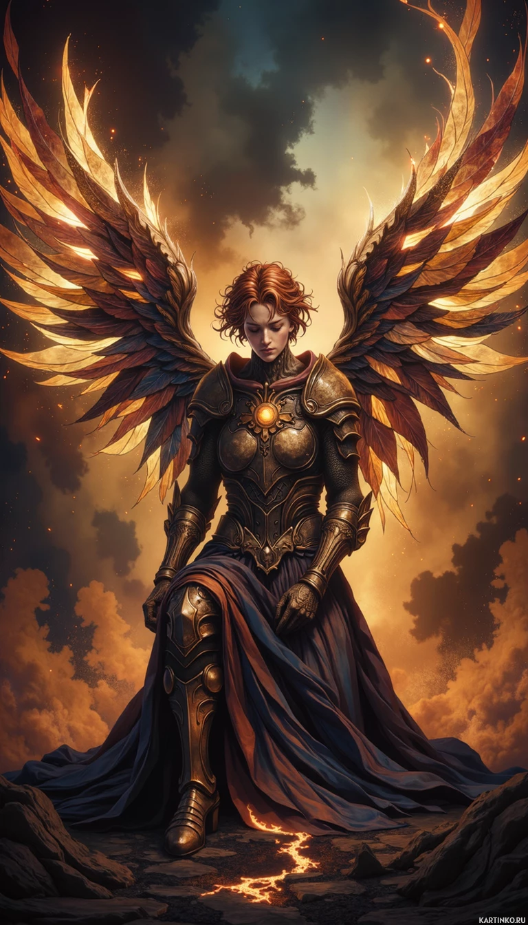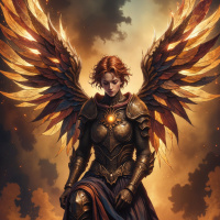 red hair, wearing what appears to be armor and has large wings. She is depicted in a standing position on