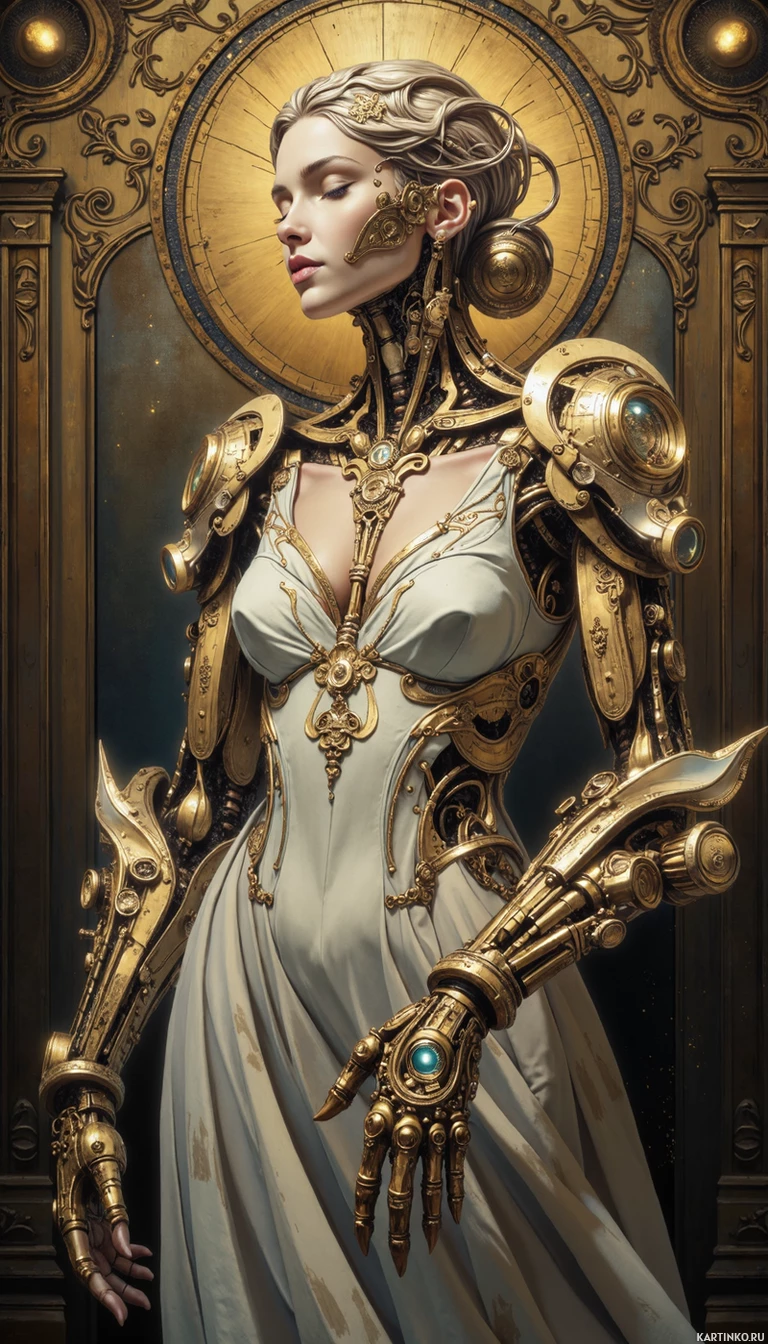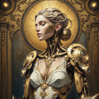 fiction setting, featuring ornate gold and silver designs that add a sense of opulence to the scene. There is also an object resembling a celestial body in the upper right corner, which could imply some significance related to space or astronomy within the context of the image's narrative. The use of closed eyes might symbolize her being connected to something beyond the physical world, perhaps suggesting a theme of spirituality or transcendence within a technologically advanced setting. The art style is realistic with a high level of detail, particularly in the rendering of the skin and the mechanical parts. The overall effect creates a captivating image that merges classical beauty with futuristic elements, evoking themes often found in science fiction genres.