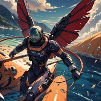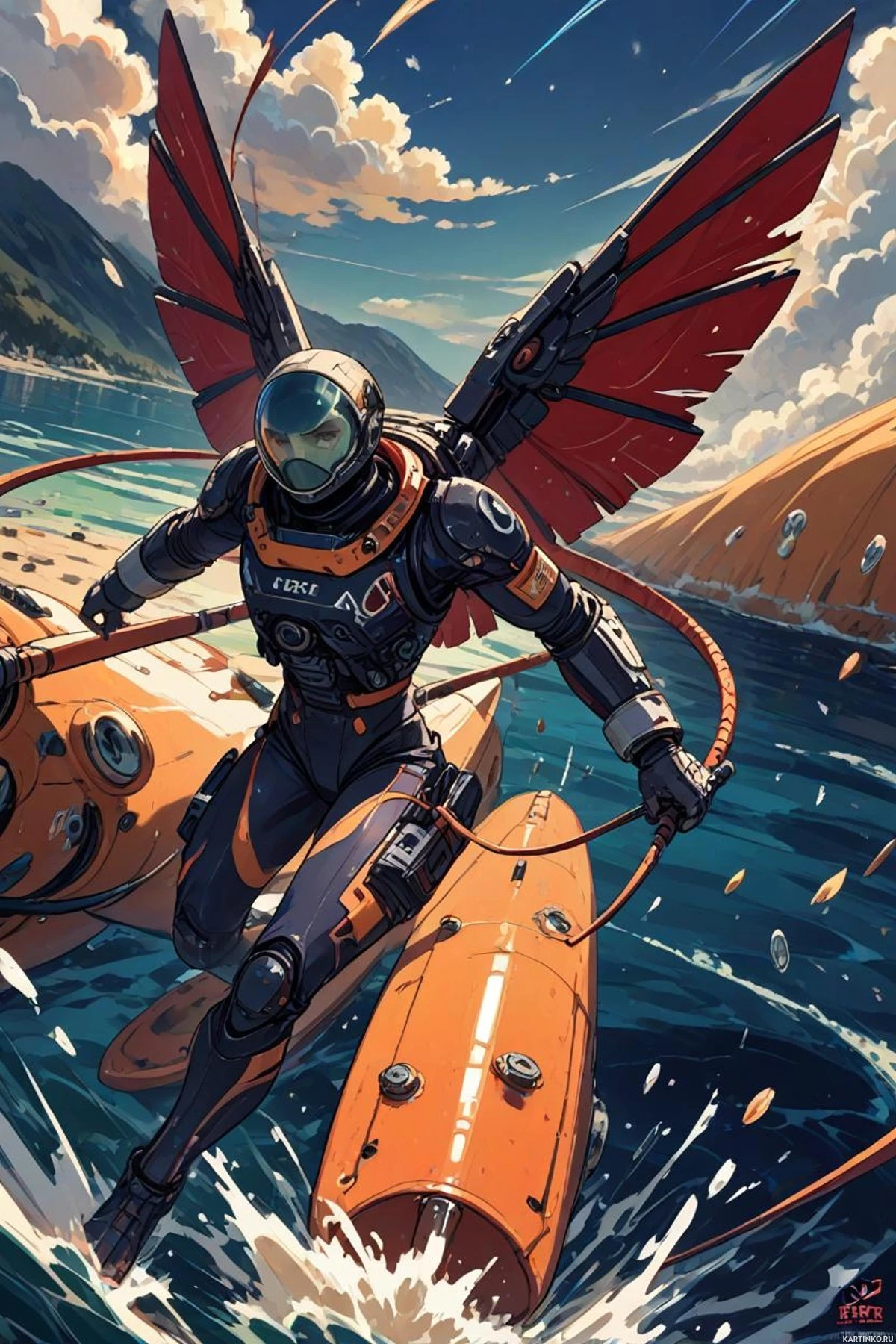 large wings attached to it. This gives the impression of a fantastical or futuristic theme. The character is shown on a surfboard floating in