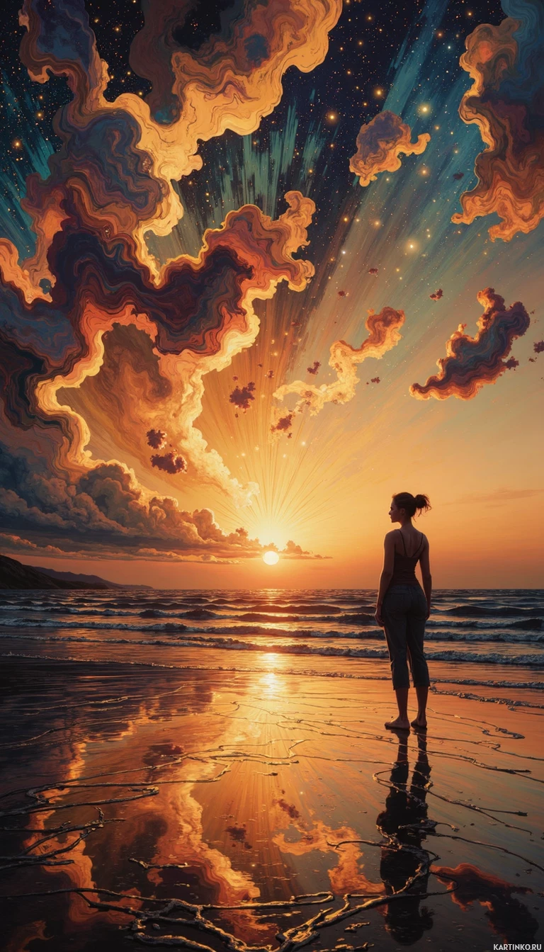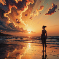 a sandy beach with her reflection visible in shallow water where sea meets sky. Her back is turned to the viewer, suggesting she may be looking towards the horizon or something off-frame. The coastline can be seen in the distance, and there's an expansive cloud in the sky that appears to be illuminated by the sunlight, creating