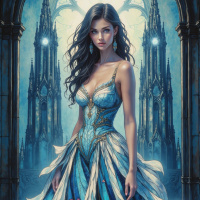 a sense of drama and elegance to the scene. The character's pose suggests confidence and poise, while her facial expression is serene. The overall effect of the image is one of fantasy or otherworldliness, perhaps suggesting that she could be a character from a story or a video game set in a medieval or fantastical world.