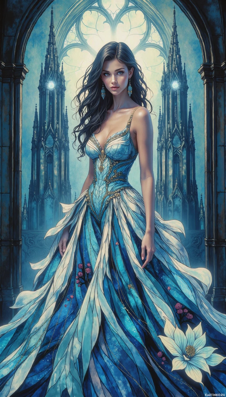 intricate designs and what appears to be feather-like embellishments or elements that give it an ethereal look. The dress's hues predominantly consist of blues and whites, creating a striking contrast with the character's