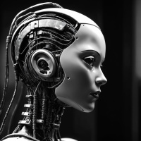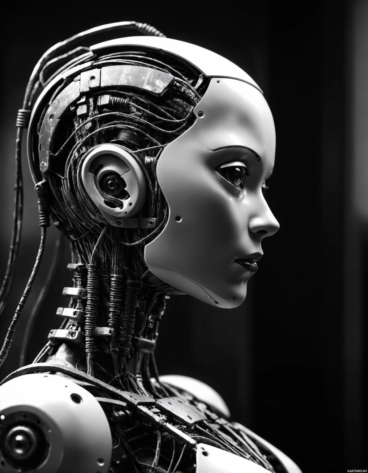 mechanical design, featuring multiple layers of components that resemble machinery. The robot's expression is neutral or slightly contemplative. The background is a dark gradient, suggesting a setting that might be associated with