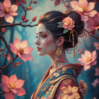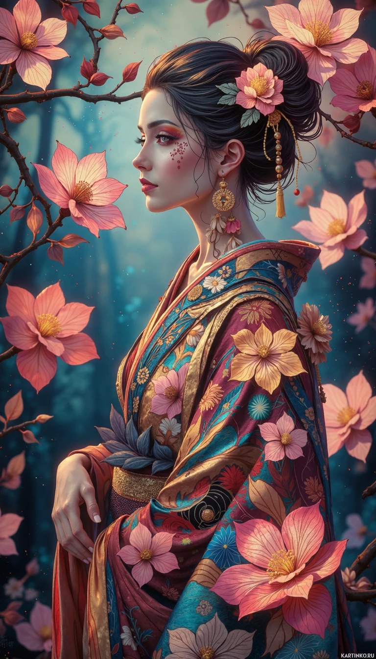 a young woman with brunette hair, adorned in traditional Japanese clothing known as a kimono. She is seated amidst