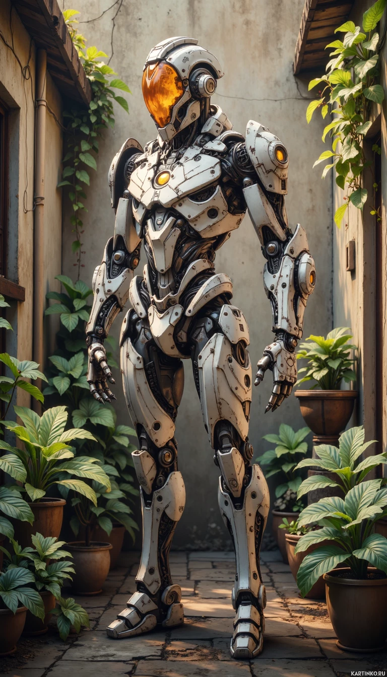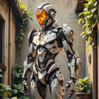 a high degree of robotic sophistication. Its head features a visor or faceplate, and it possesses a prominent red eye on its