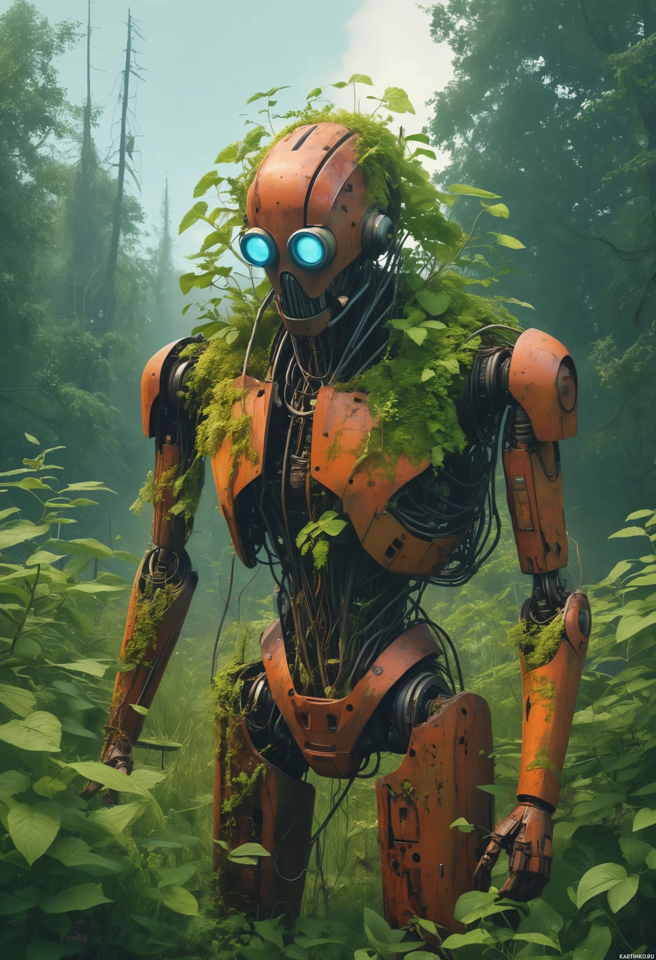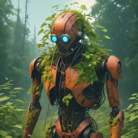 a lush environment. There's a patch of vibrant green moss growing on the robot's head area, partially covering its topmost head-like structure, which is equipped with blue glowing eyes that give it an expressive appearance. The artwork captures a moment of stillness amidst nature, with the robot seemingly at peace within its environment. The overall composition suggests a theme of technology and organic life coexisting harmoniously.