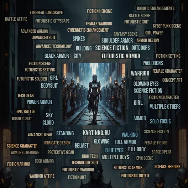 science fiction. In the background, there are several other figures that look like they could also be warriors or soldiers, given their similar attire and the combat-readiness implied by their postures. The overall atmosphere is intense and action-packed, with an element of mystery due to the obscured faces and
