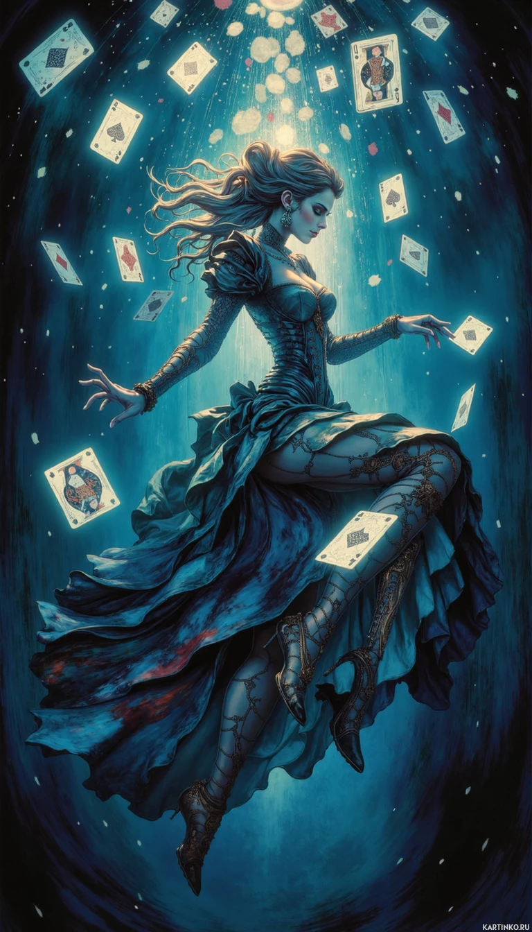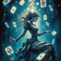 an otherworldly setting, possibly hinting at a fantasy or mystical context for the character. Surrounding her are various playing cards floating in the air, and they seem to be interconnected by what could be interpreted as a psychic connection or